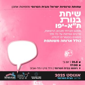 שיחת בנות מפגש בבית הטרנסיעמותת טרנסיות ישראל והבית הטרנסי מזמינות אתכן לשיחת בנות - מפגש חודשי לנשים טרנסיות בת"א-יפו. מפגש חברתי מגבש, הרצאות, סרטים ושיחות על כל מיני נושאים הקשורים לכולנו. ... 25 نوفمبر16:00 - 19:00 הבית הטרנסי