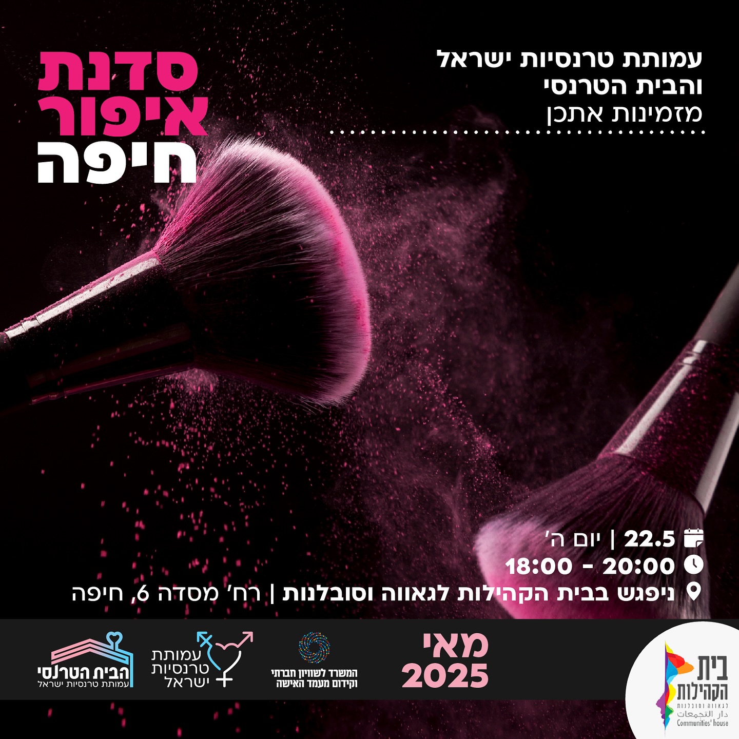 סדנת איפור בבית הקהילותעמותת טרנסיות ישראל והבית הטרנסי מזמינות אתכן לסדנת איפור לנשים טרנסיות בבית הקהילות בחיפה+ Add to Google Calendar+ iCal / Outlook export DateOct 05 2025Expired! Time 17:00 - 19:00 Locationבית הקהילות - לגאווה וסובלנות Category סדנאותOrganizer טרנסיות ישראלShare this event