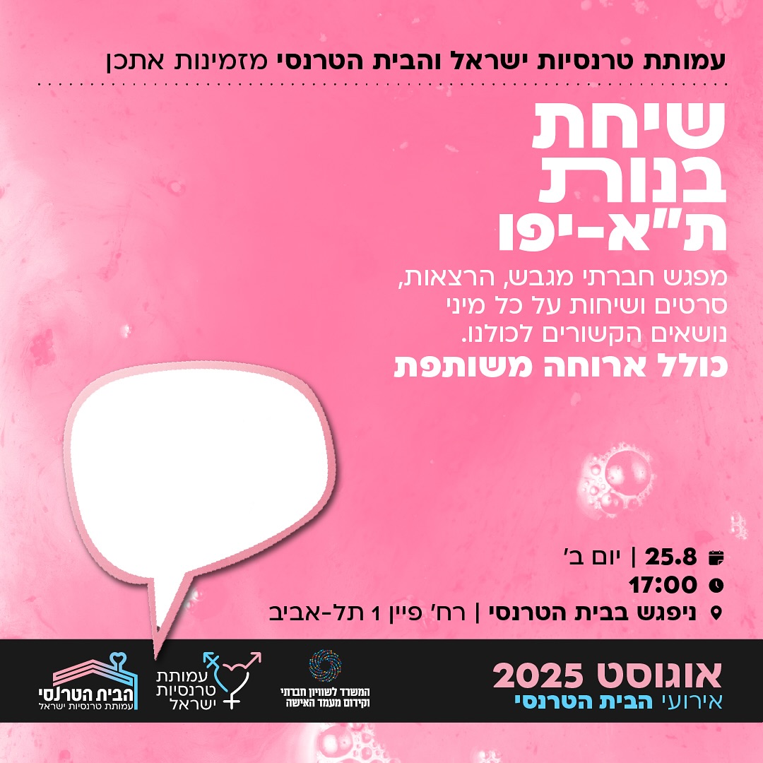 עמותת טרנסיות ישראל והבית הטרנסי מזמינות אתכן לשיחת בנות – מפגש חודשי לנשים טרנסיות בבית הטרנסי בת”א.