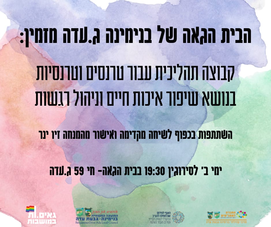 הקבוצה בהנחיית ינר זיו (את) תתקיים בימי ב' אחת לשבועיים בשעה 19:30 בבית הגאה של בנימינה ג.עדה