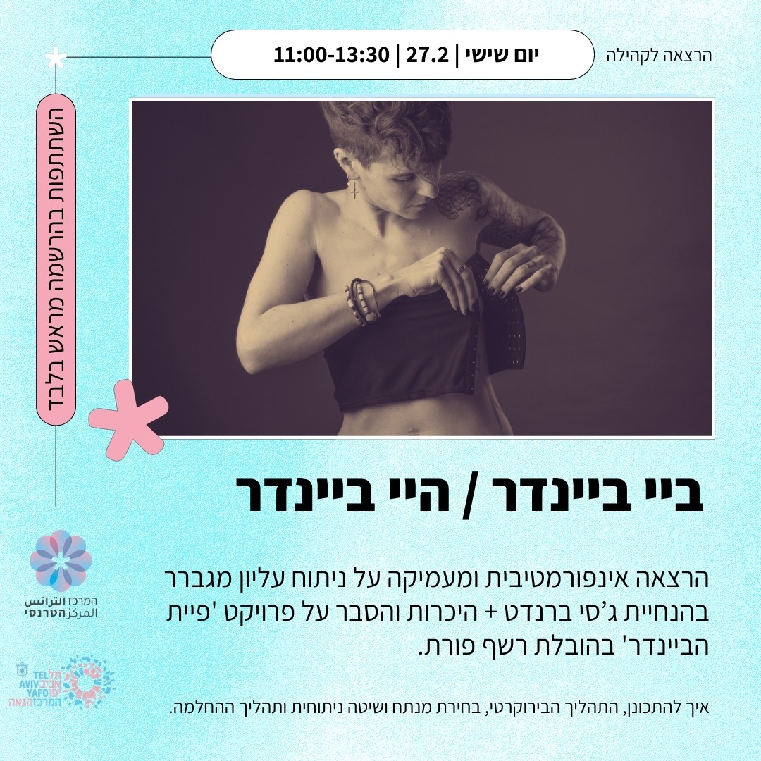 בהרצאת "ביי ביינדר" נדבר על כל מה שרציתם לדעת על ניתוח עליון מגברר, המפגש רלוונטי לכל מי ששוקל.ת תהליך התאמה מגדרית עם ניתוח עליון או ניתוח להקטנת חזה.