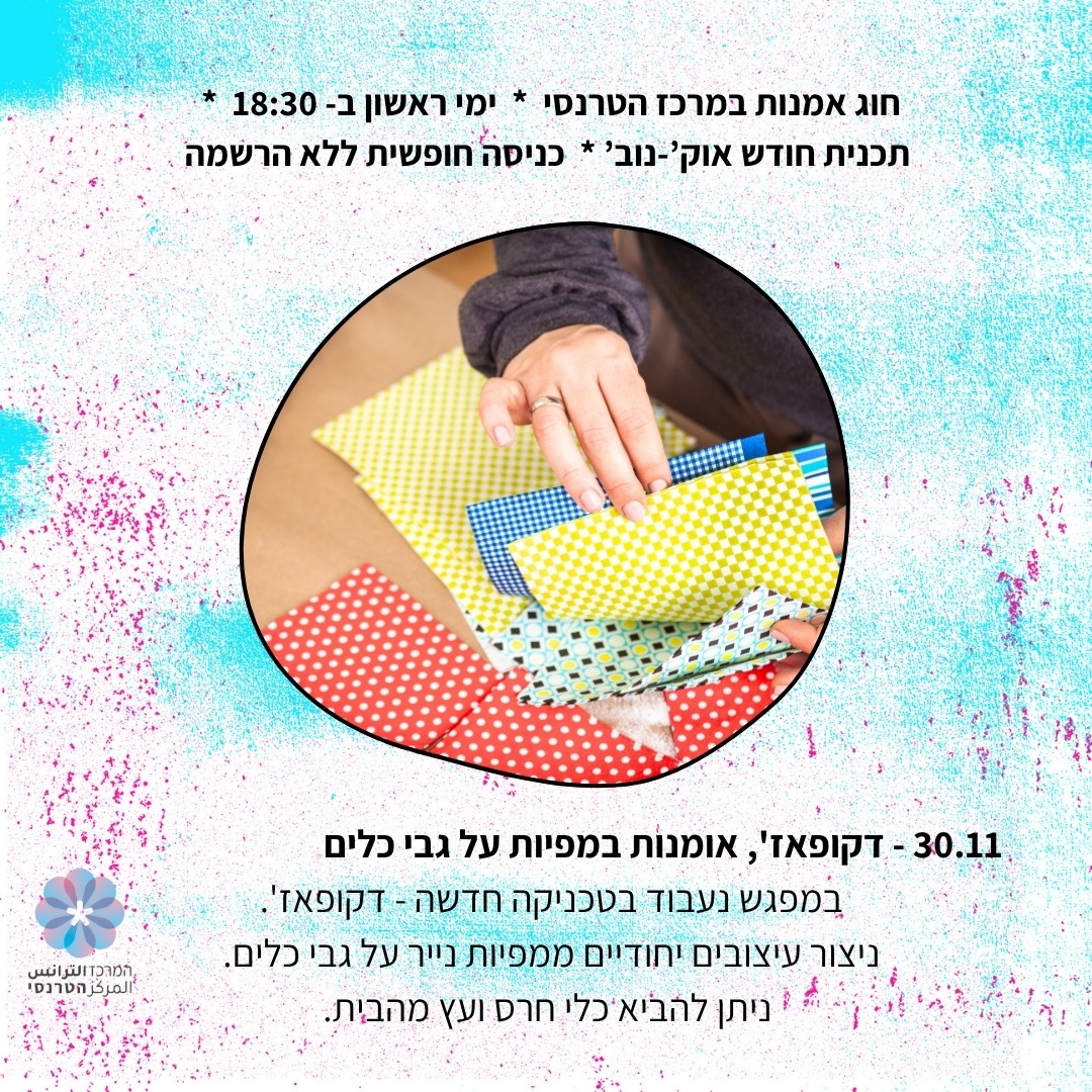 דקופאז', אומנות במפיות על גבי כלים – במפגש נעבוד בטכניקה חדשה – דקופאז'. ניצור עיצובים יחודיים ממפיות נייר על גבי כלים. ניתן להביא כלי חרס ועץ מהבית.