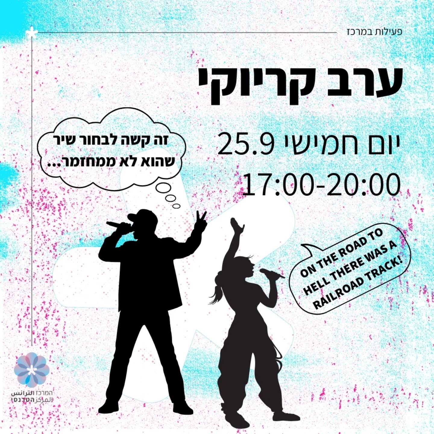 ערב הקריוקי החודשי במרכז הטרנסי! הוא תיכף כאןןןן ערב הקריוקי החודשי במרכז הטרנסי!זה הזמן לשחרר את הזמר.ת הפנימית שבךיום חמישי | 25.9 | 17:00-20:00בואו לבחור שיר, לזייף בקול גדול, או פשוט להרים מהקהל ולהנות ביחד, כי קריוקי זה תרפיה עם מיקרופון לא צריך להירשם, פשוט להגיע+ Add to Google Calendar+ iCal / Outlook export Dateספט 25 2025Expired! Time 17:00 - 20:00 Locationהמרכז הטרנסי مركز الترانسמרדכי אנילביץ' 62, תל אביבWebsite https://www.transcenter.org.il/ Category קריוקי Organizer המרכז הטרנסי مركز الترانس Website אתר המרכז הטרנסי مركز الترانسShare this event