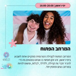 מרחב טרנסי פתוח של המרכז הטרנסי במרכז הגאה תל אביבזהו זמן חופשי בו אנחנו נפגשים.ות כדי להכיר חברי.ות קהילה, ללרלר, לבלות, ופשוט להיות במרחב נעים ומזמין יחד. ... 18 ינו16:00 - 20:00 המרכז הגאה - TLV LGBTQ Centerטשרניחובסקי 22, תל אביב