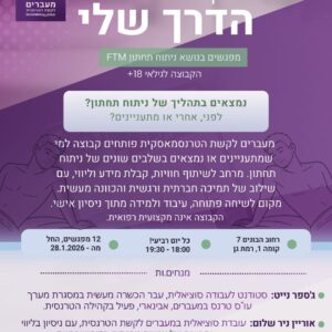 הדרך שלי – קבוצה חברתית למפגש ושיתוף סביב ניתוח תחתון FTMקבוצה המיועדת לכל הקשת הטרנסמאסקית שנמצאים בתהליך של ניתוח תחתון - לפני, במהלך או אחרי - ומחפשים מרחב לשיתוף, קבלת מידע וליווי בתהליך. ... 04 פבר18:00 - 19:30 מעברים לקשת הטרנסיתהבונים 7, קומה 1, רמת גן