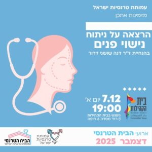 הרצאה בנושא ניתוח נישוי פנים – חיפהעמותת טרנסיות ישראל מתרגשות להזמין אתכן להרצאה על ניתוח נישוי פנים! ההרצאה תהיה בהנחייתה של ד"ר דנה שושני דרור, מנתחת בבית החולים איכילוב. ... 07 דצמ19:00 בית הקהילות - לגאווה וסובלנותמסדה 6, חיפה